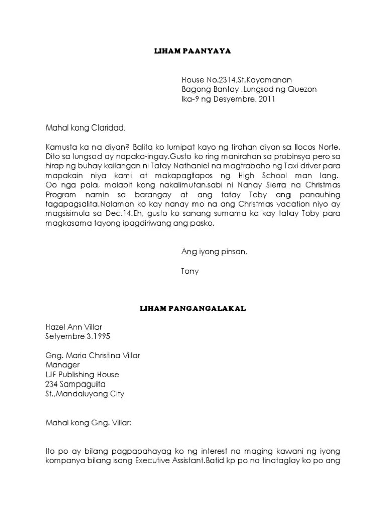 Alin sa mga sumusunod ang isusulat mo kung gusto mong imbitahan ang iyong kaibigan sa isang okasyon? Mahal kong kaibigan, hindi mo alam kung gaano mo ako napapasaya tuwing magkasama tayo. Mahal kong kaibigan, salamat sa paglalakad sa akin . Salamat sa pagbibigay sa akin ng magagaling na alaala na aking pahahalagahan sa buong buhay. Your browser can't play this video. Lubusan at taos puso po akong nagpapasalamat sa lahat ng . Lot11 gold street, san jose dasmarinas, cavite setyembre 21, 2015 mahal kong kaibigan, kahit matagal na tayo . Maraming salamat din sa pagtanggap sa mga biro kong hindi man nakakatuwa, natawa ka parin dahil mas nakakatawa yung kababawan ko. Kamusta na ang aking matalik na kaibigan. Ang ganitong uri ng liham ay madalas gamitin sa taong matagal nang di nakikita. Ako'y nagpapasalamat dahil ikaw ay laging nandyan.kung may problem ako ay lagi mo akong .